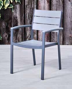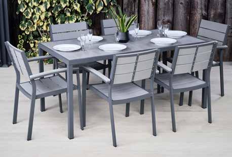 Popular plastic and aluminium square and rectangular tables with matching stacking armchairs in grey. This furniture is weatherproof and easy to clean.
