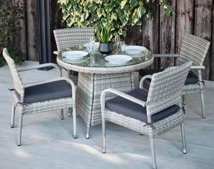 Add an elegant feel to your patio or terrace. Commercial grade, synthetic weave rattan with a strong aluminium base, the table tops are tempered safety glass attached with suckers.