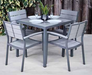Popular plastic and aluminium square and rectangular tables with matching stacking armchairs in grey. This furniture is weatherproof and easy to clean.