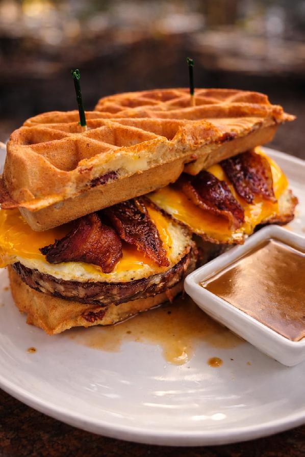 Experience a mouthwatering combination of sausage, crispy bacon, perfectly cooked over-easy eggs, and rich American cheese, all drizzled with a delectable maple bourbon sauce and sandwiched between two fluffy waffles. This scrumptious morning delight was created by our very own John Lassus.