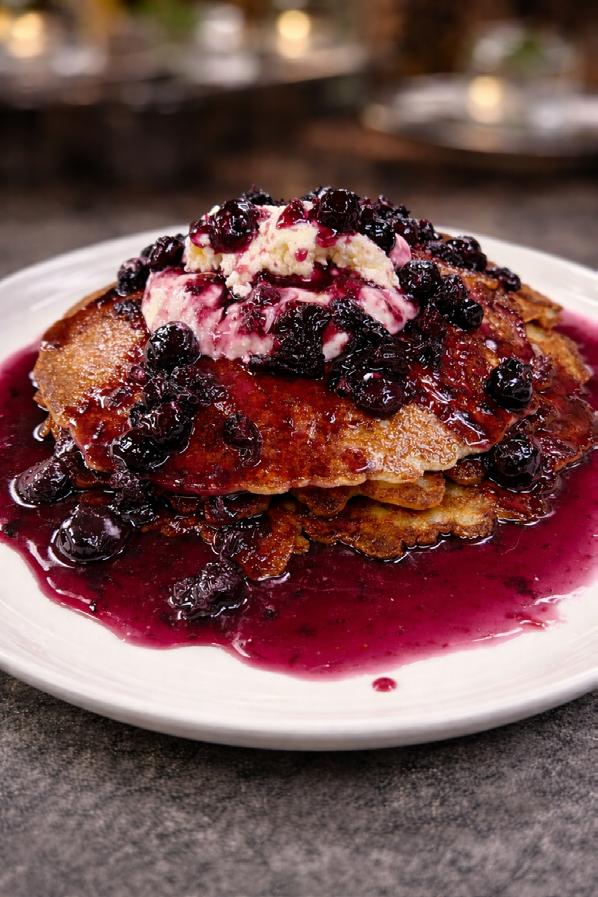 Treat yourself to a light and fluffy stack of pancakes layered with a zesty lemon ricotta cream cheese,