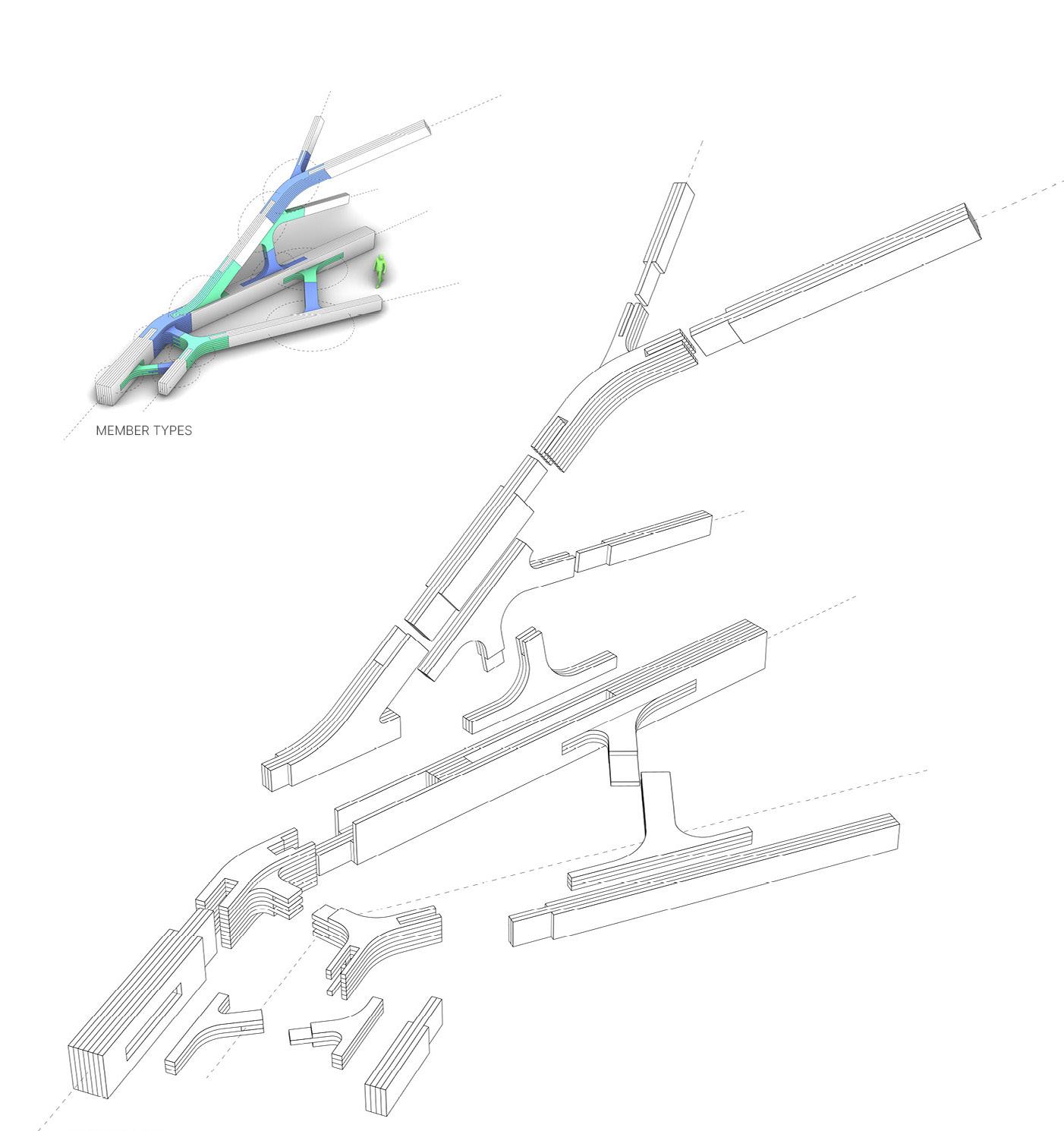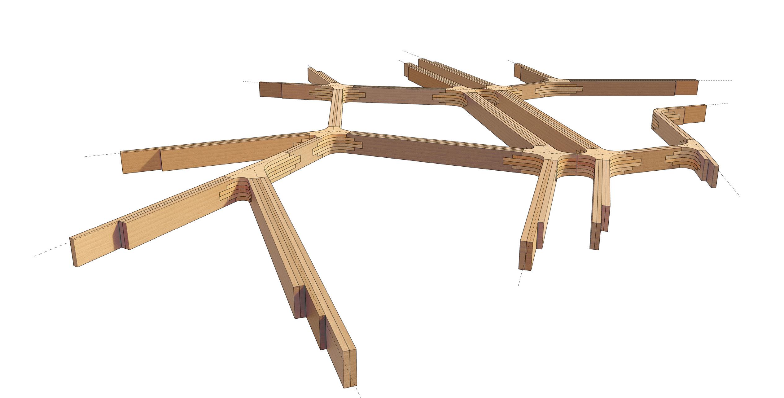 Working from a research phase investigating the possibilities of a complex series of nodal glue laminated (Glulam) components, the project speculates on the development of timber fabrication technologies, specifically with a focus on connection strategies. The research focuses on a volumetric frame typology in contrast to the more typical master surface adherence in Glulam. It proposes therein a concentration of fabrication complexity at connection points, while the rest of the timber frame is made up of straight sections.