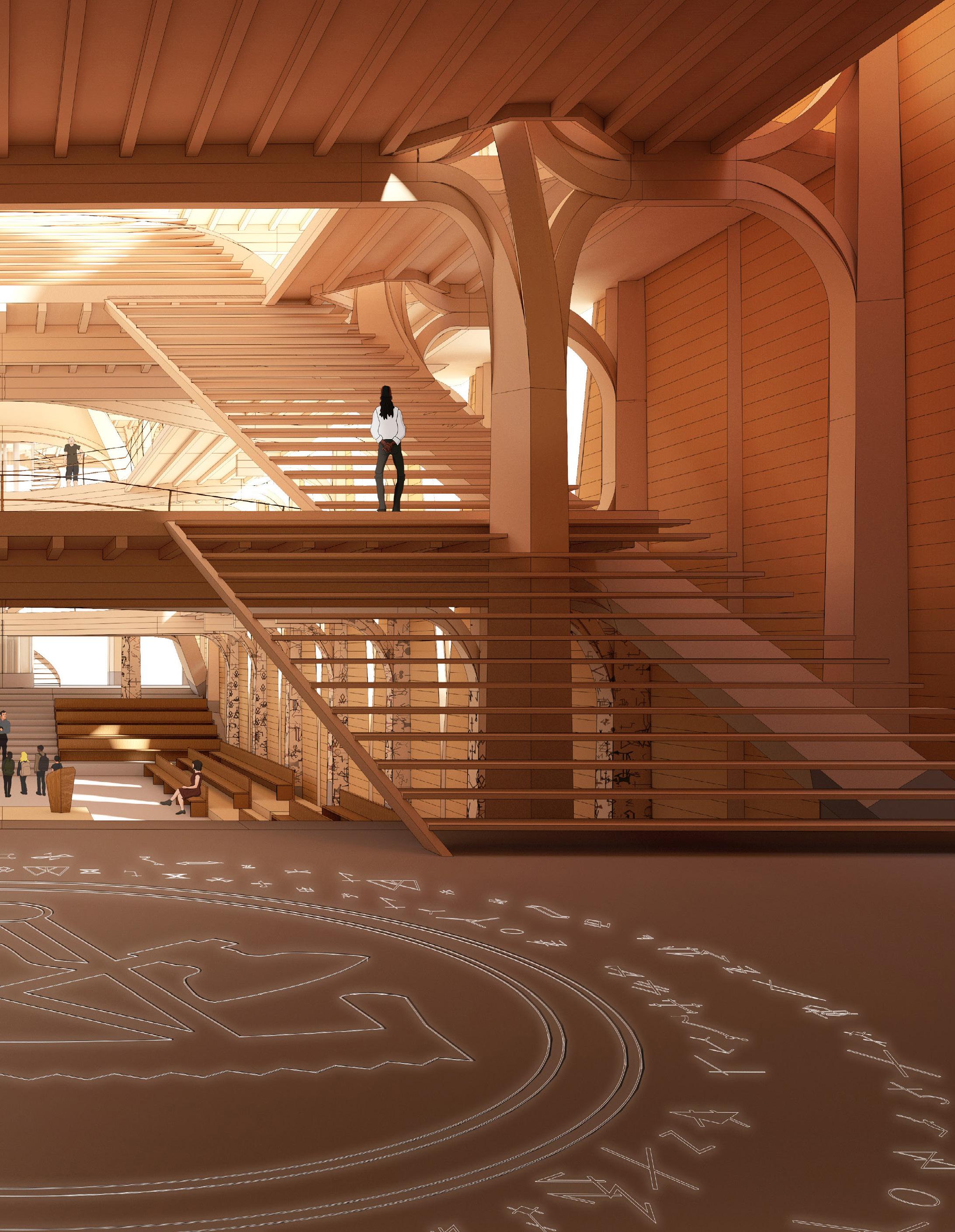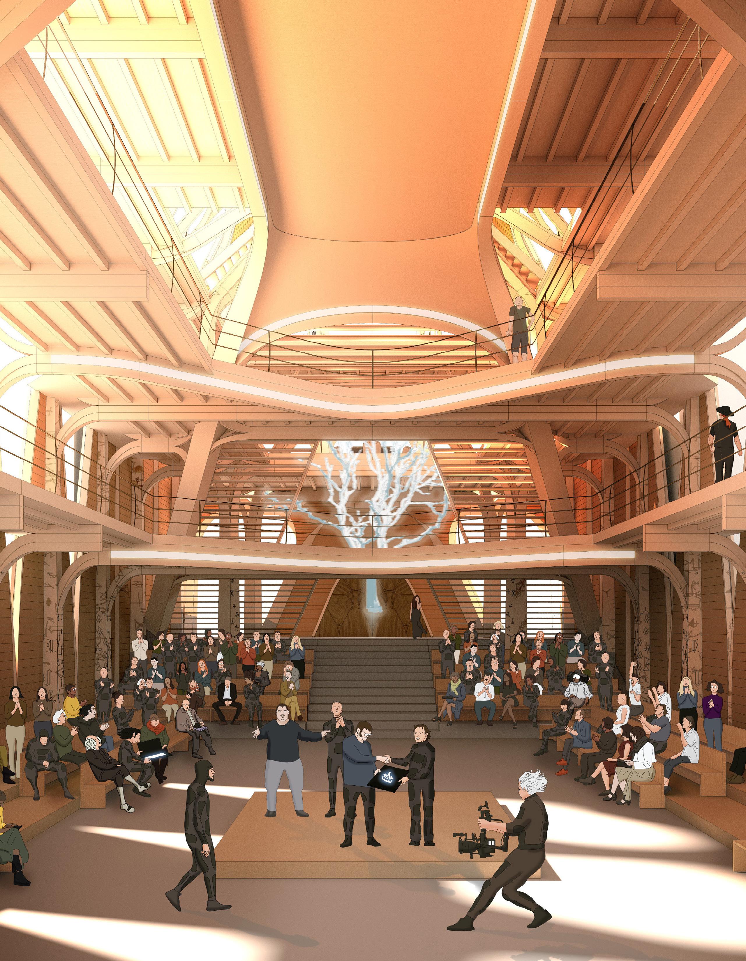 A formal language is developed using varied folded conditions that have the ability to control circulatory transparency to public spaces, filtering access into the station, while also stiffening these shear walls into a structural tube that can host vertical circulation or wrap components of the nuclear process. The timber craft ascends into smaller folds that create apertures at a high-level allowing light to pierce through, emulating a sense of divinity in the space where this energy is produced.