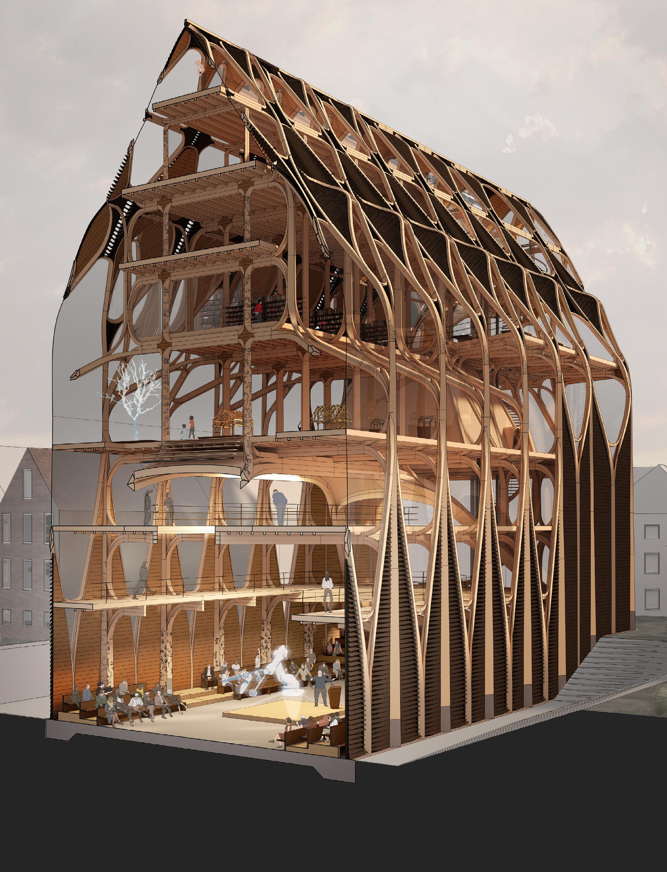 that you will find that the architectural proposals are rooted in fundamental understandings of timber as a material that has inherent physical and structural properties that allow it to be shaped, manipulated, assembled, repositioned, modified, amalgamated, and constructed in ways that challenge standard convention, yet also feel and present themselves as oddly familiar.