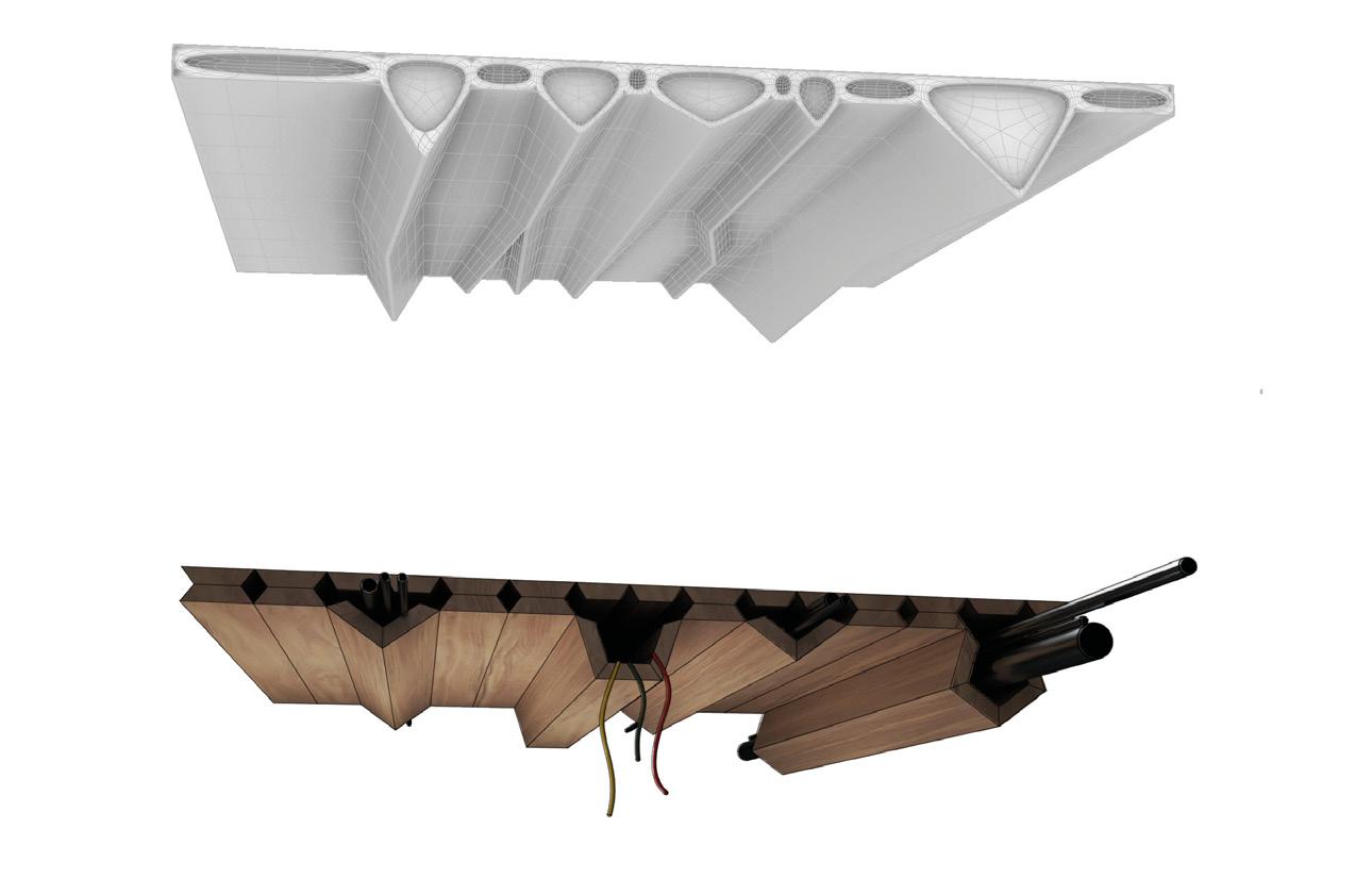 Further detailed investigations developed the assemblies as a series of intelligent parts, containing a hollow space for running services, whilst being machined to receive one another. This extends to the lamination strategy itself, where different species are employed in the laminated wood build-up in response to variation in the structural, aesthetic and durability requirements.