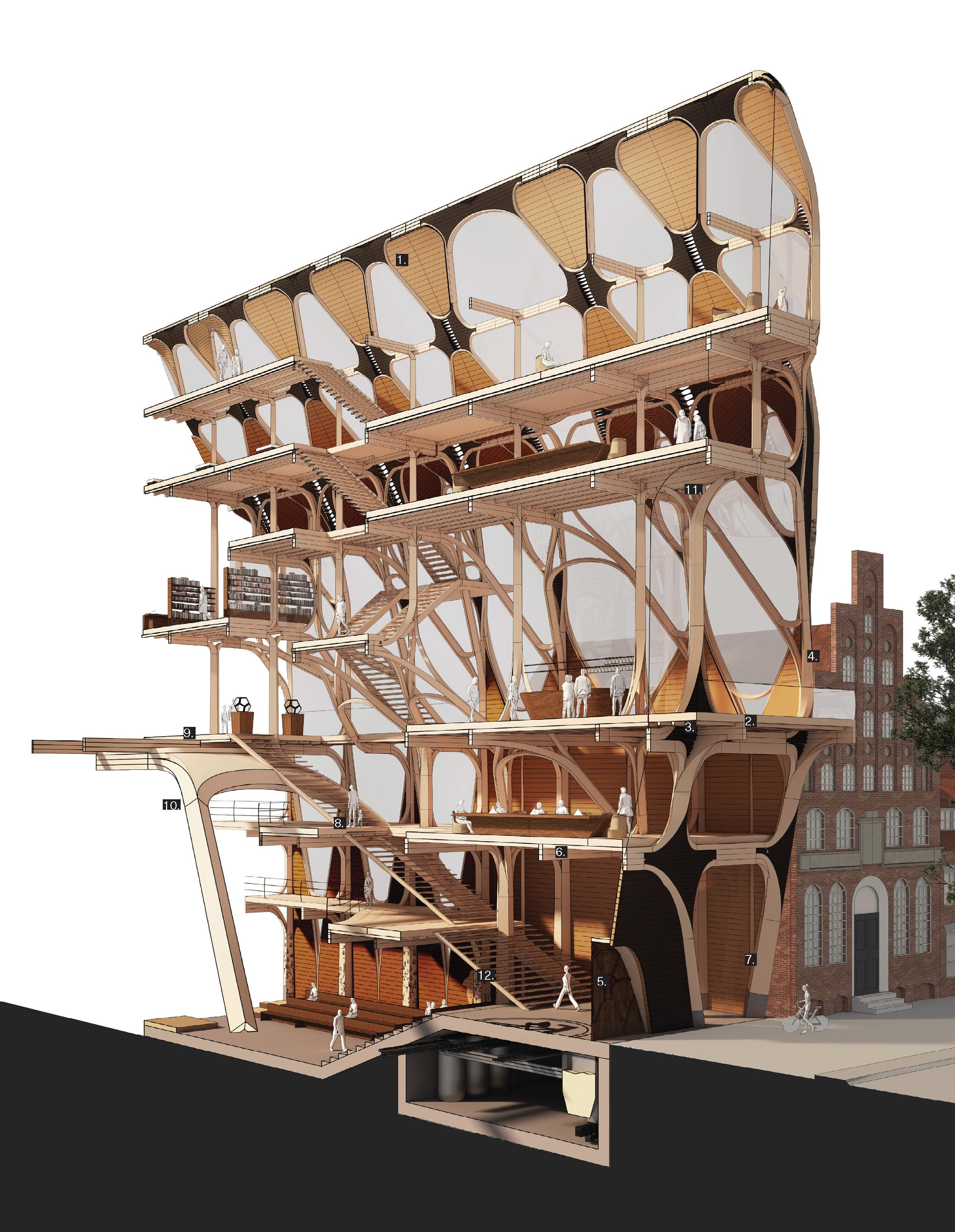 The project imagines a future guildhouse for timber framers, situated in the northern German city of Lübeck. The proposal builds on and seeks to rekindle this now lost but formerly valuable building typology.