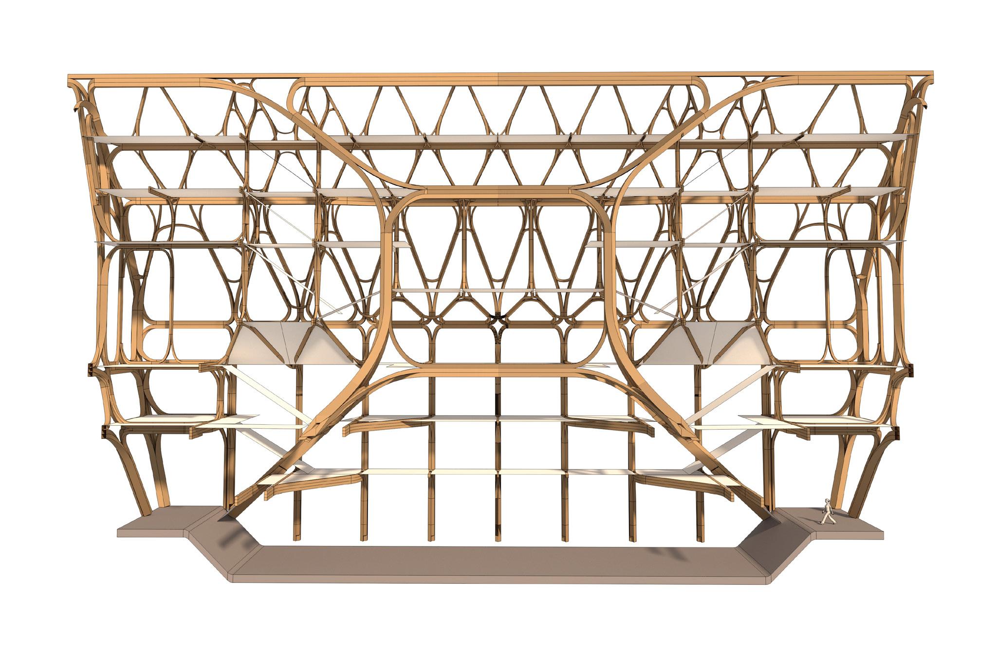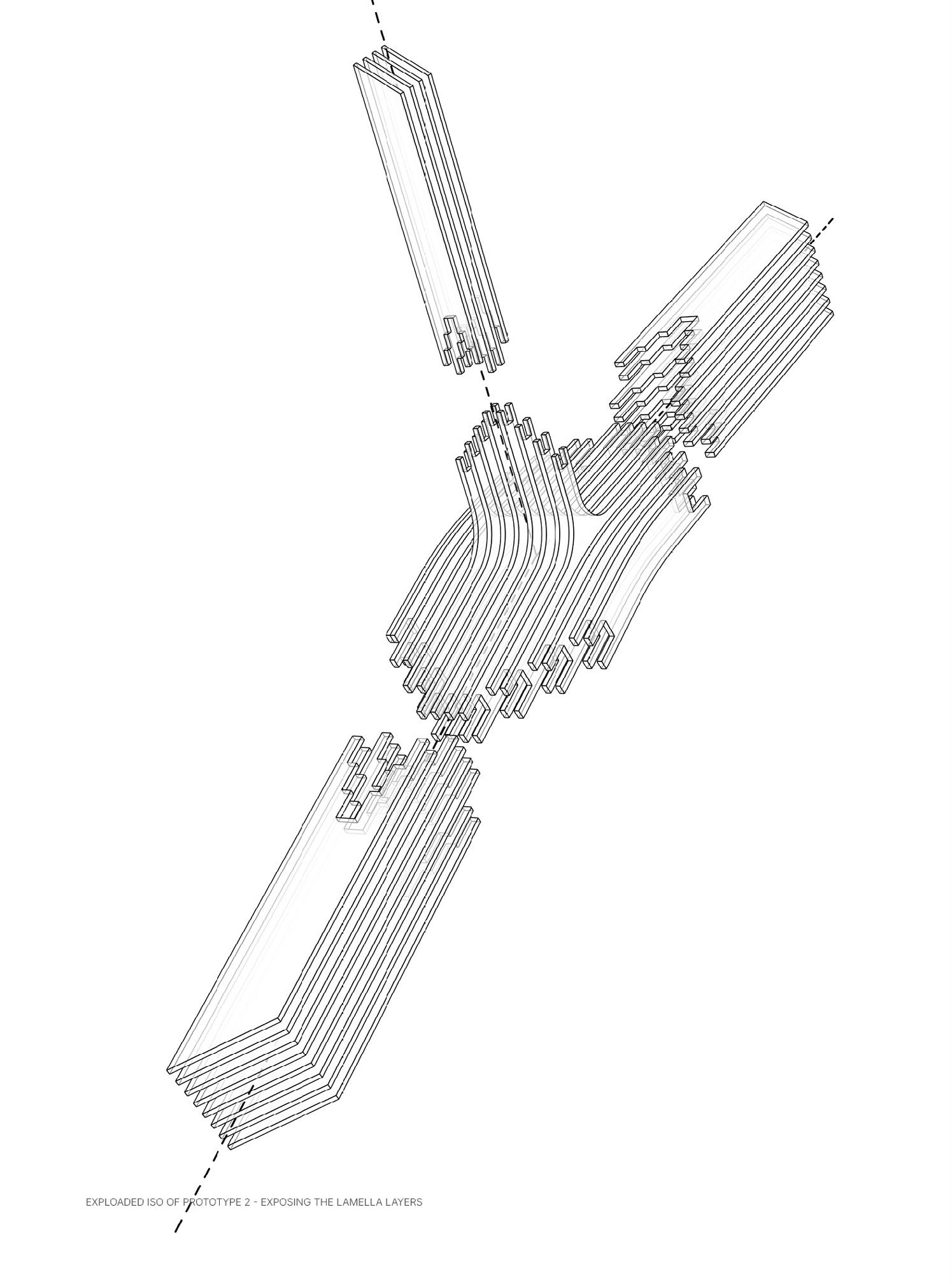 Projects developed previously within the Unit have investigated structurally folded Cross Laminated Timber (CLT) for the use of column free structural assemblies. The use of Zippering to create a free-form timber frame. The use of scaled traditional bamboo construction methods through bundling to achieve large span structures. The leveraging of performative variation in the application of differentiated timber species in composite to achieve enhanced performance objectives across an overall assembly. The reinterpretation of both traditional Japanese and Chinese tectonics through contemporary laminated fabrication. A frictionally wielded dowellaminated timber system in both cross and linear lamella directions to harness the material’s optimum properties to achieve continuous geometries, which eliminated the necessity for resins and glues in the manufacturing process. As well as a novel form of three-dimensional veneer lamination informed by the anisotropic properties of timber, providing a lightweight and mass customizable