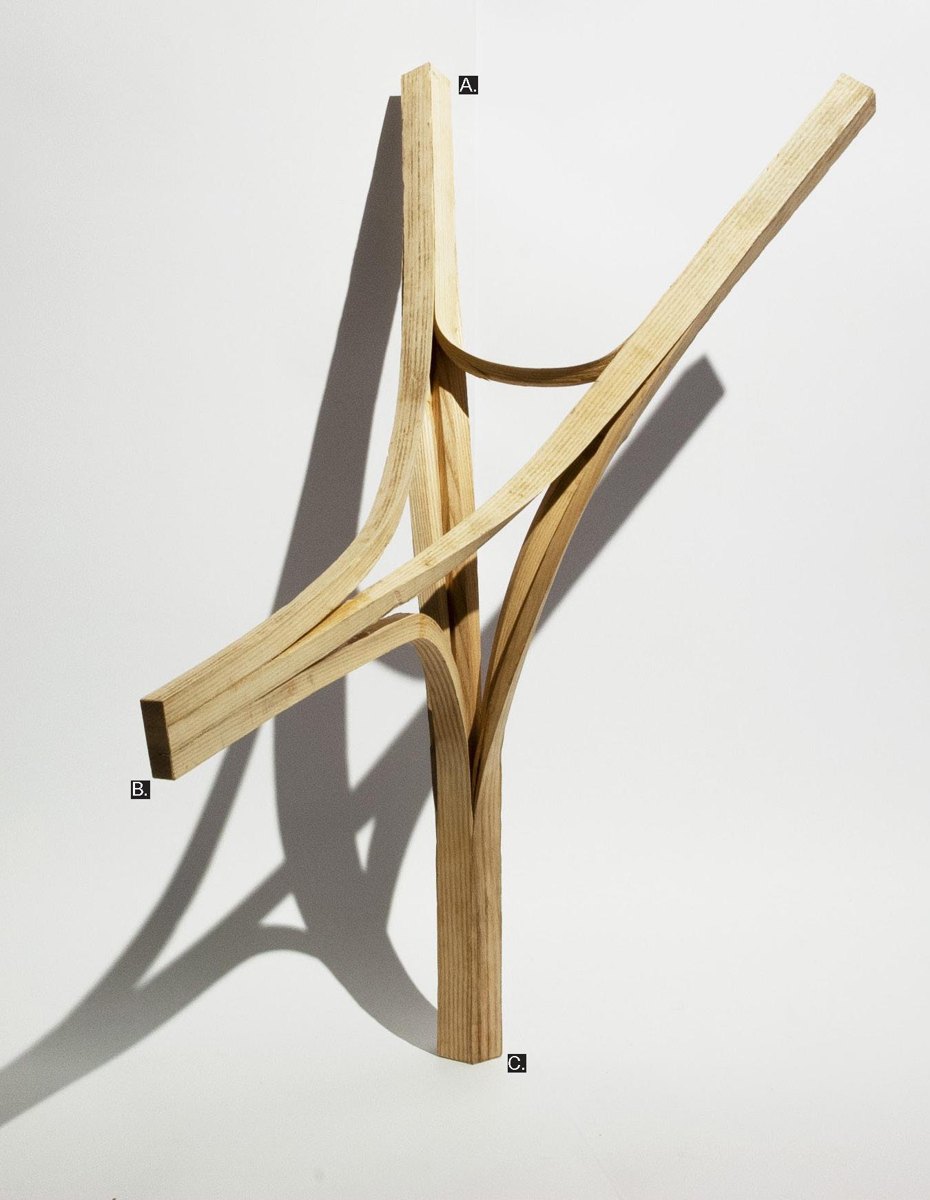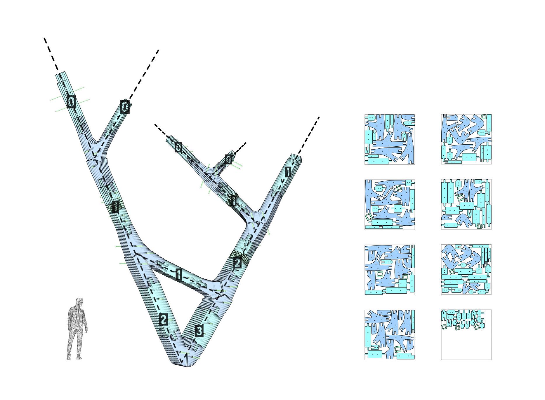 The project commenced with a review of timber construction and its history, and an analysis of current FFT design and fabrication practices. Computational experiments were then undertaken, and digital models and physical prototypes were created to test the development of a free-form structure. This informed the development of a design-to-fabrication computational system and algorithm that automates the production of a free-form structure determined by line-and-curve 3D networks and the inherent load conditions imposed upon it.