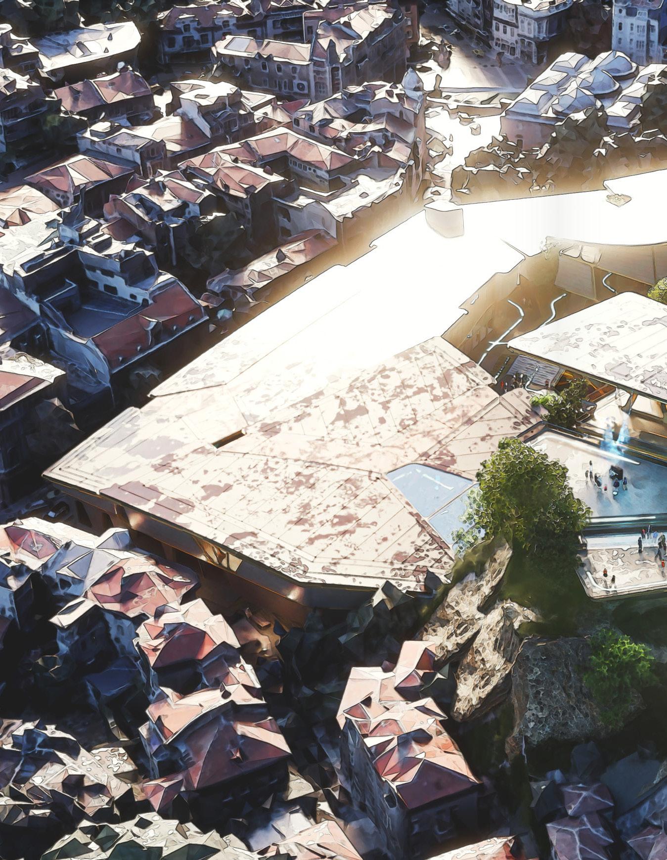 The goal of the project is to a envision a new hybrid lifestyle for the local community, which allows for the simultaneous coexistence of technology and myth, civicness and community, building and landscape.