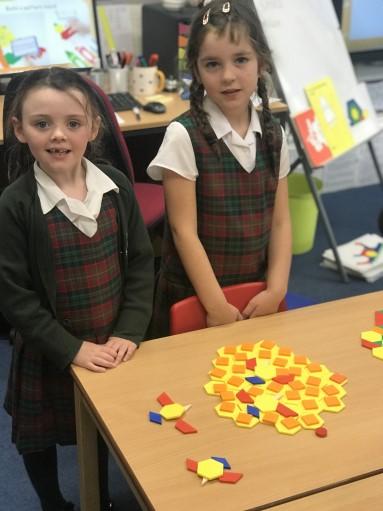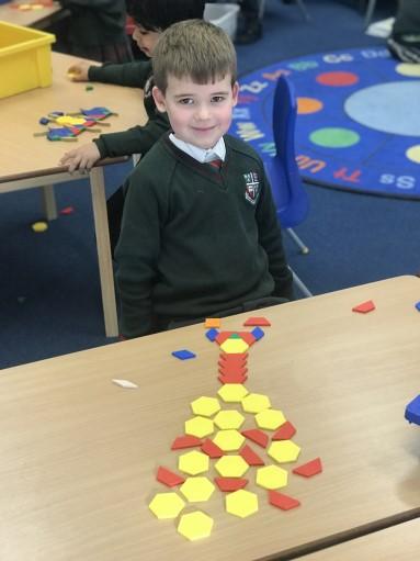 In STEM Club, Year 1 & 2 designed patterns using block shapes. They carefully arranged the shapes to design a pattern or a picture. Hexagons inspired honeycomb and bees; green triangles were blades of grass. Some children even designed their own inventions a leaf collector and a honey collector.