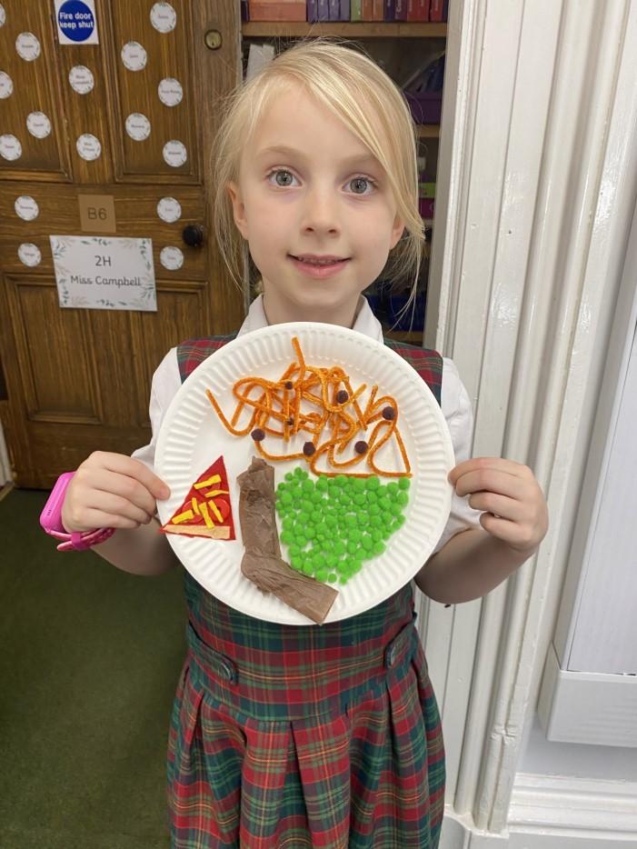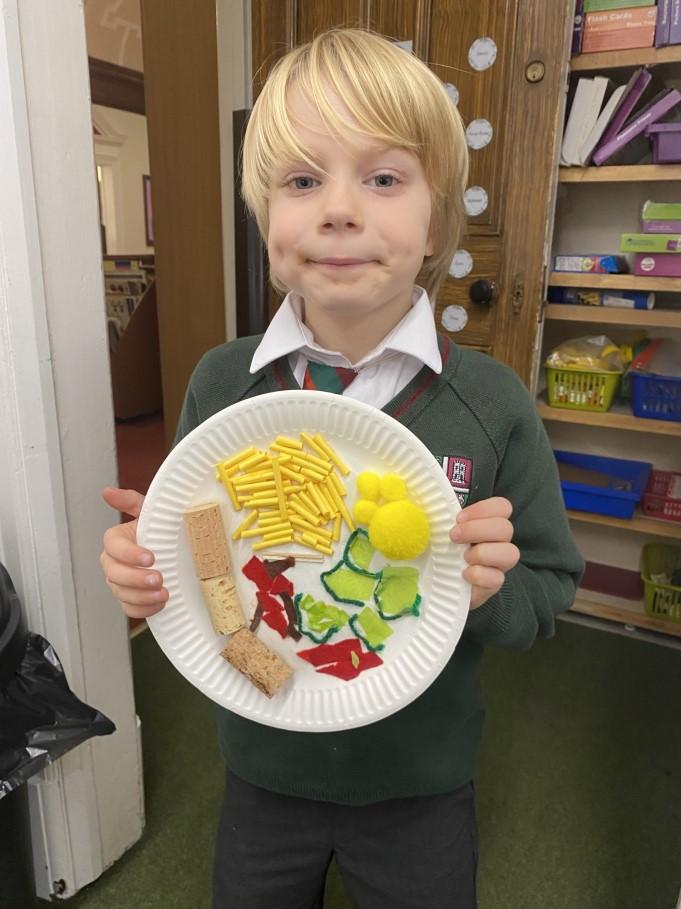 Year 2 have been creating healthy balanced meals using different materials combining their science, topic and DT lessons. They have been very creative; Acer made his cucumber using pipe cleaners and tissue paper, Ava-Rose made spaghetti bolognaise using pipe cleaners and pom poms.