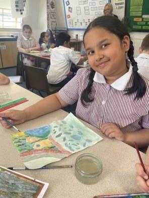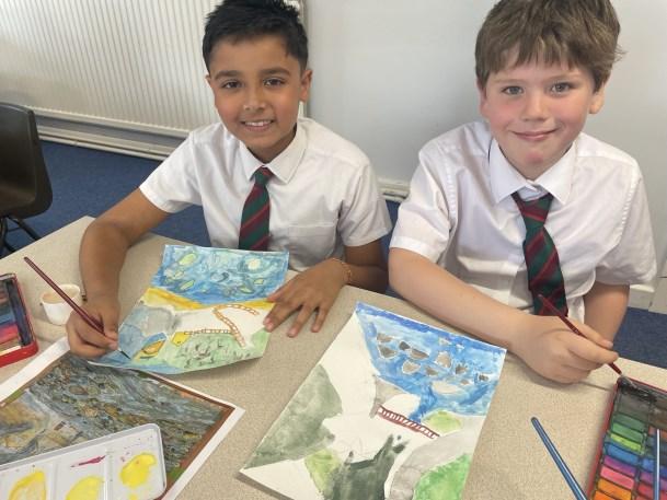 Inspired by their recent residential to the North Yorkshire coastline, Year 4 used watercolour washes to paint the beach and rockpools exposed whilst the tide was out, looking inland towards the Boggle Hole.