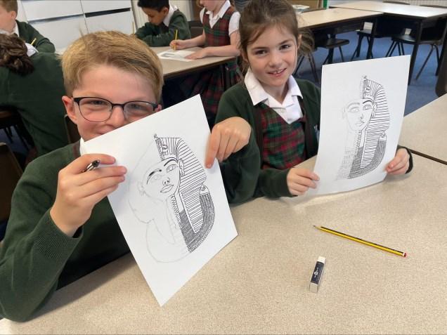 This week in Year 3 art lessons, the children have been drawing with control and accuracy to complete a mirrored image of an Egyptian Pharoah with impressive results!