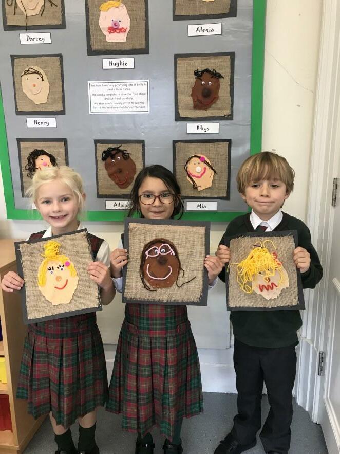 For Year 1’s topic on portraits they created some facial artwork. They drew around a template onto felt, then cut out a face shape. Using a running stitch, they joined the felt face to a hessian background and then attached collage materials for the facial features.