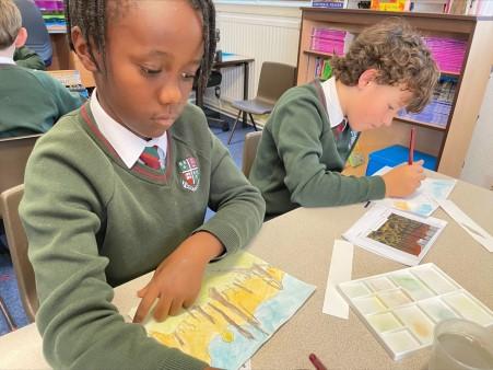 In recent Year 6 art lessons, the children used water colours to re-create artwork in the style of World War I artist Paul Nash with some very impressive results!
