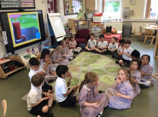 Reception have been thinking about summer fruits and did fruit tasting. They tasted a variety of fruits including strawberries, nectarines and apricots. At the end they voted for their favourite with strawberries being the top pick.