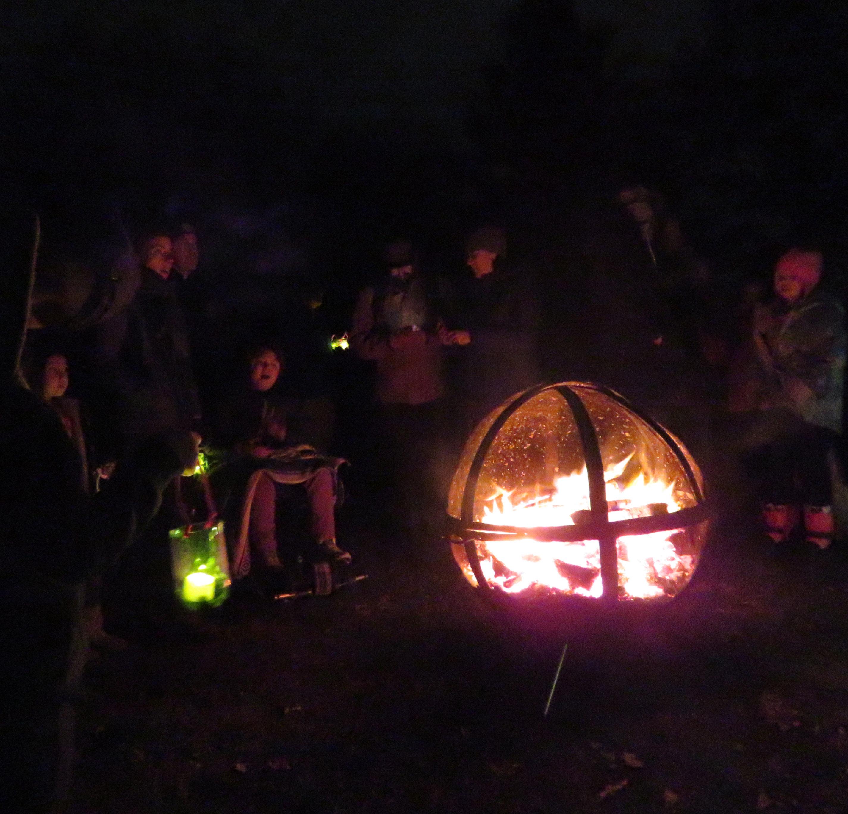 The night ended with a walk through the woods of WHMS, guided by the light of our lanterns and glow stick path to a gathering around the bonfires at the soccer field with rounds of singing led by Jessa Pelizari.
