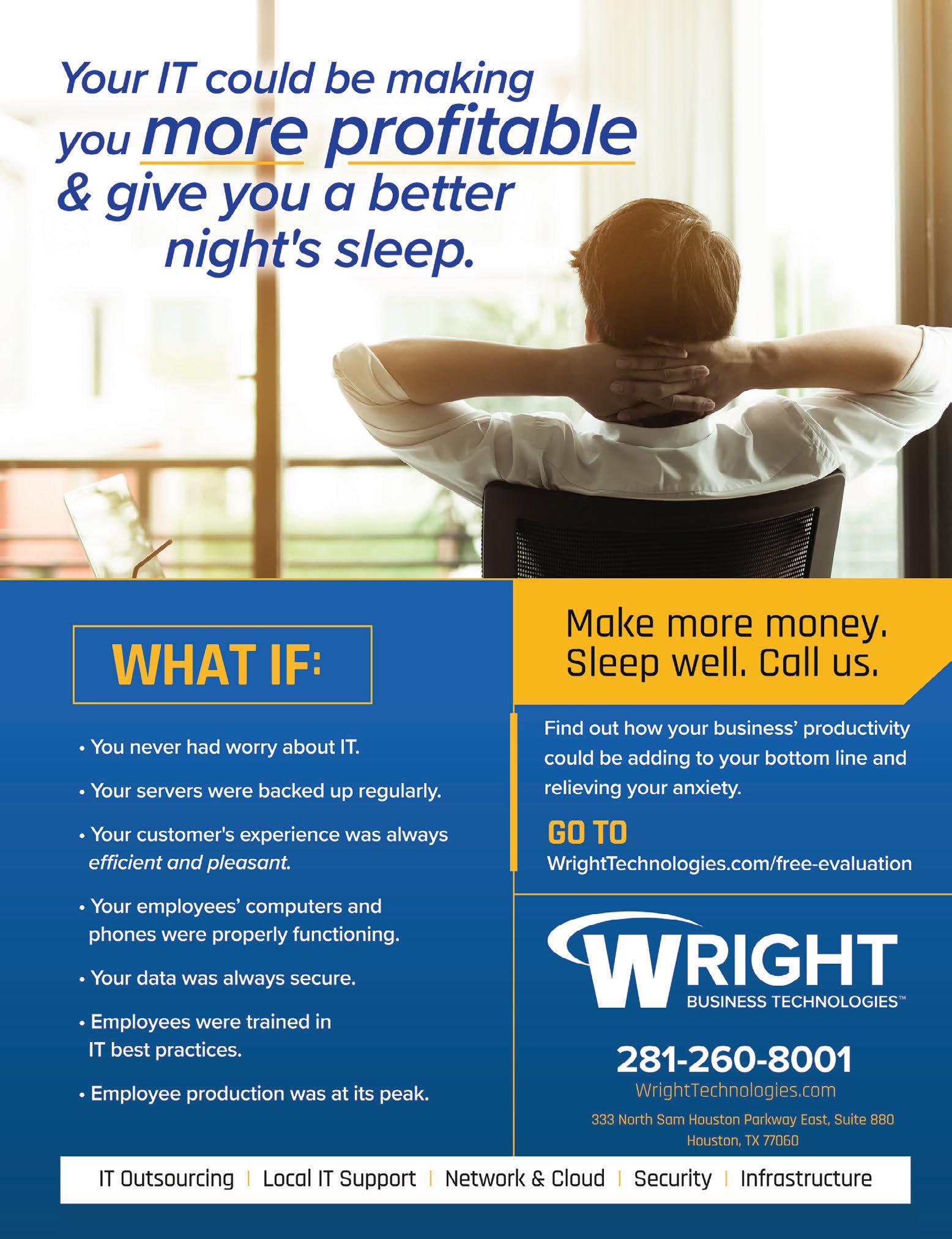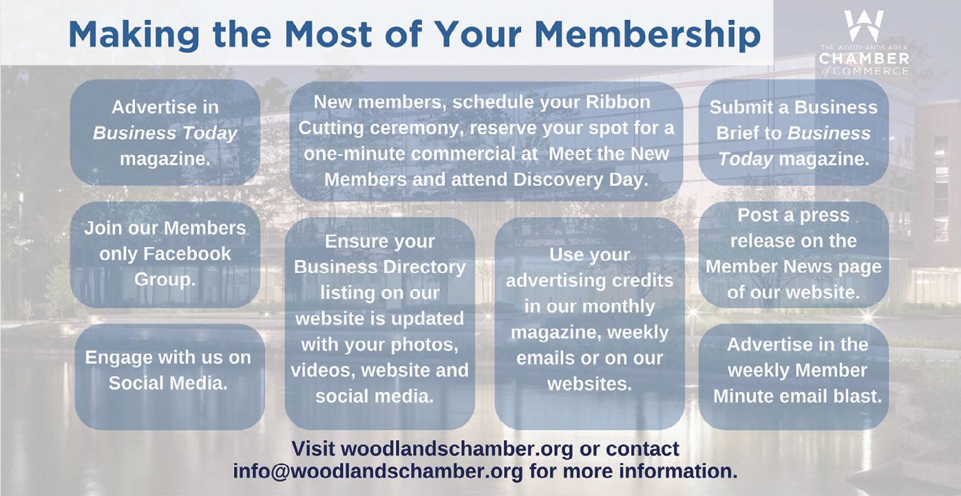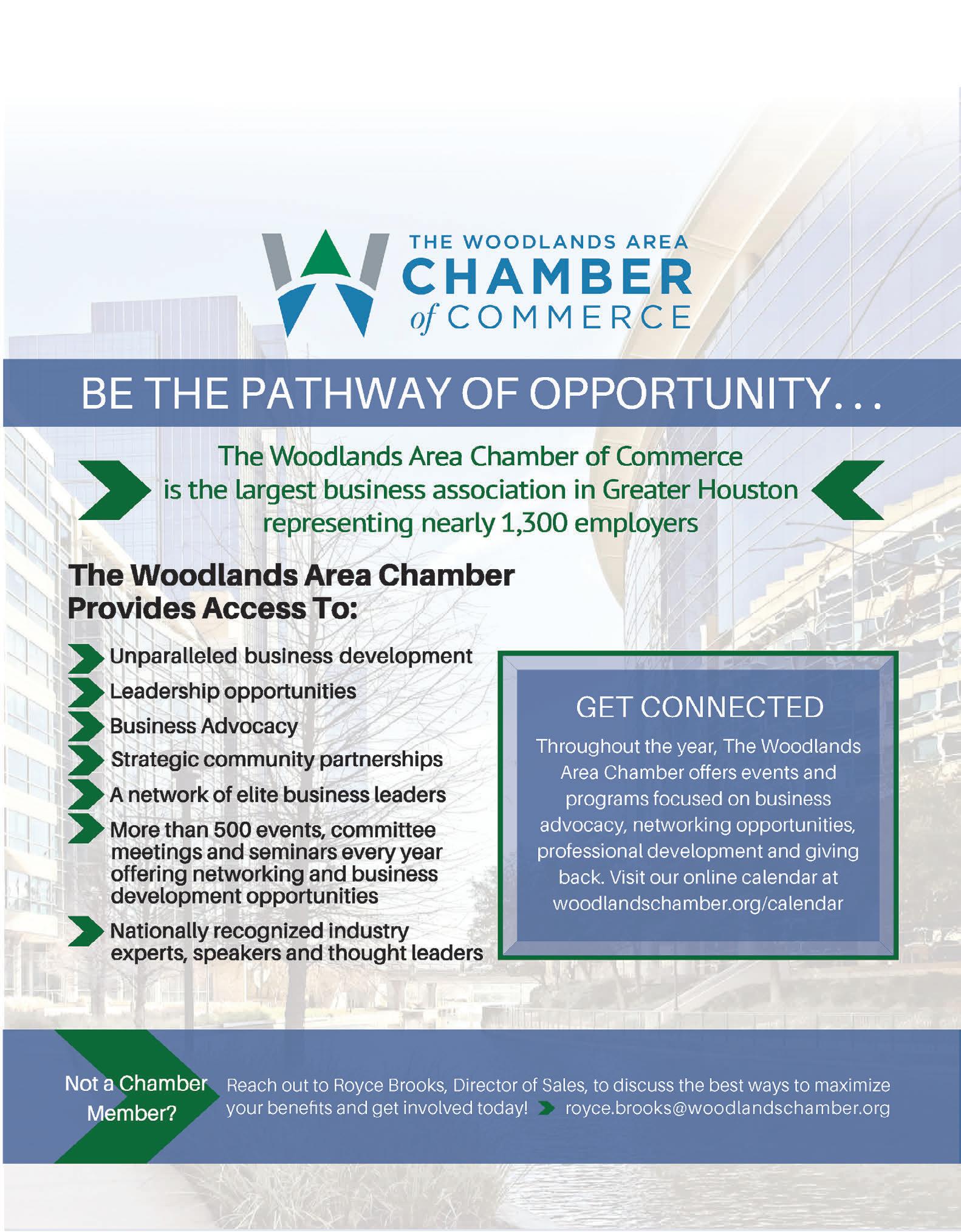 monthly magazine produced by The Woodlands Area Chamber of Commerce featuring news, articles and events from The Chamber and our members. Business Today offers a variety of advertising options including editorial pieces. See the Business Today media kit and read the latest issue at woodlandschamber.org/business-today.