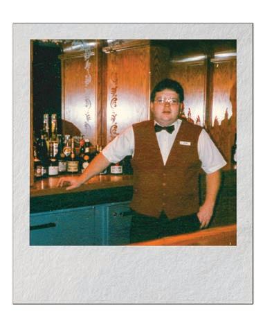 I worked in the dining room for a bit, then I was a cocktail waiter and bar back. I liked the bar because it changed every day, you never knew what to get ready for. It was always dii erent and it still is. You never knew where the crowd was going to go. It made the days exciting and they went FAST.