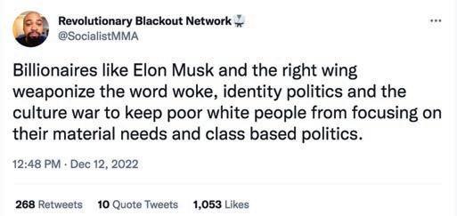 Anti-wokeism — if you will permit me a somewhat counterintuitive turn of phrase— is identity politics dressed in drag. Fixation on fighting “wokeness” corrals people into mainstream establishment-serving frameworks in exactly the same way identity politics corrals people into mainstream establishment-serving frameworks. It makes sure the rankand-file public stays busy barking and snarling at one another instead of the people in charge.