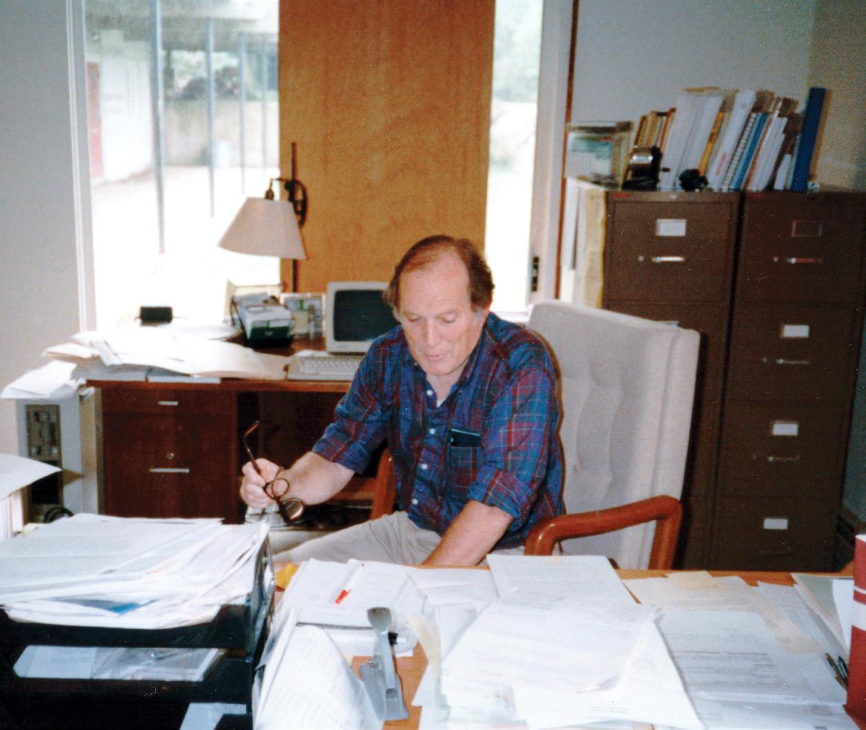 left: George Woodwell at his desk in the early years of Woods Hole Research Center.
