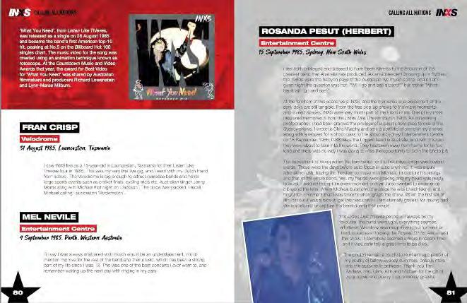 INXS fans are the central focus of this official publication Calling All Nations: A Fan History of INXS. Named after the INXS song, with over 400 pages of fan accounts, memorabilia, artifacts, photographs, magazine and newspaper clippings. Artfully arranged, the popping graphics of the book revolve around INXS’ signature black, white and red.