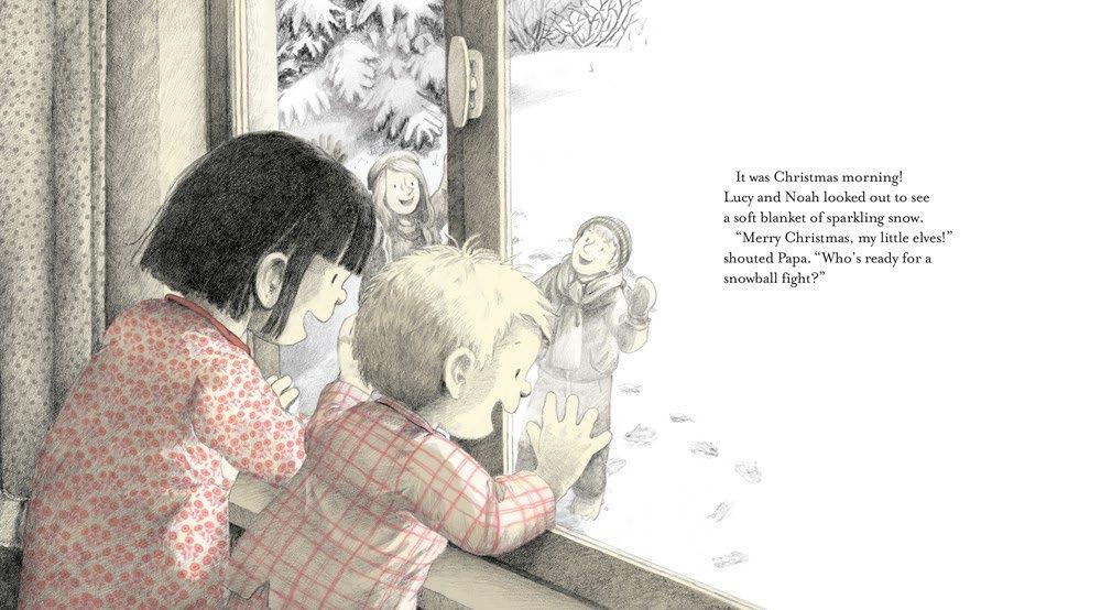 Lucy lies awake looking at the snow globe, disappointed that it won’t be a white Christmas. Suddenly, she feels something soft and cold land on her cheek.