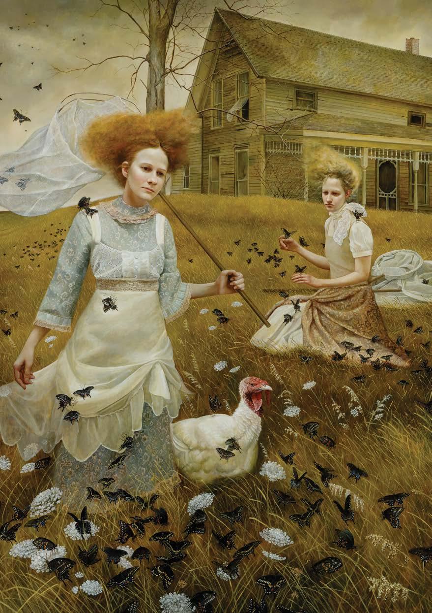 Using timeless imagery of powerful women, sprawling country and scenes of magical surrealism that evoke not-so-distant times and places, Andrea Kowch has risen to be one of the leading figurative realists working today. The Michigan artist is a powerhouse of a painter who is comfortable working large and with complex compositions, and yet her work is also delicate, sensitive and willing to carefully embrace her audience with empathy and compassion. Here in these pages, viewers can step into Kowch’s world to meet her strong-willed subjects, live in her gorgeous settings and explore her powerful themes of love, womanhood, strength and independence.