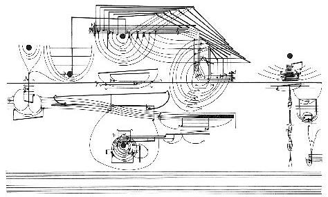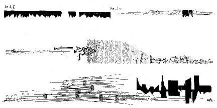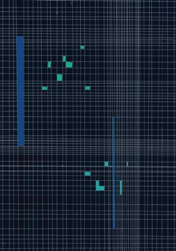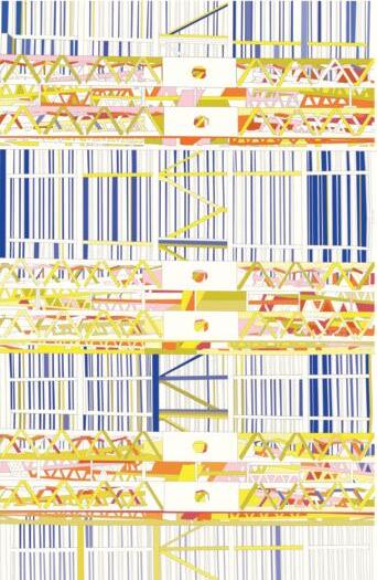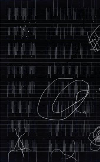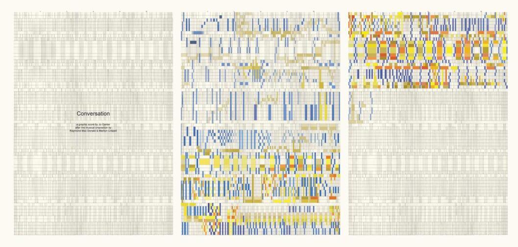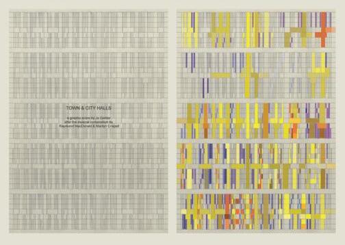 Runn ng Under Bridges is the itle of works by the Scot ish col abora ors, MacDonald and Gan er They have co-authored a series of or ginal prints and musical compos tions that test he possibi ities of images as conduc ors of sound, and sound as a compositiona ool or images. In rica e, gr d- ike ma r ces prov de boundaries for blocks o color or tone and crea e emporal structures for the music. Crea ed wi h hand-drawn pencil lines and then scanned or drawn on the computer, hese images move between hand-crafted and digita echniques, without dif ferentiating be ween the wo