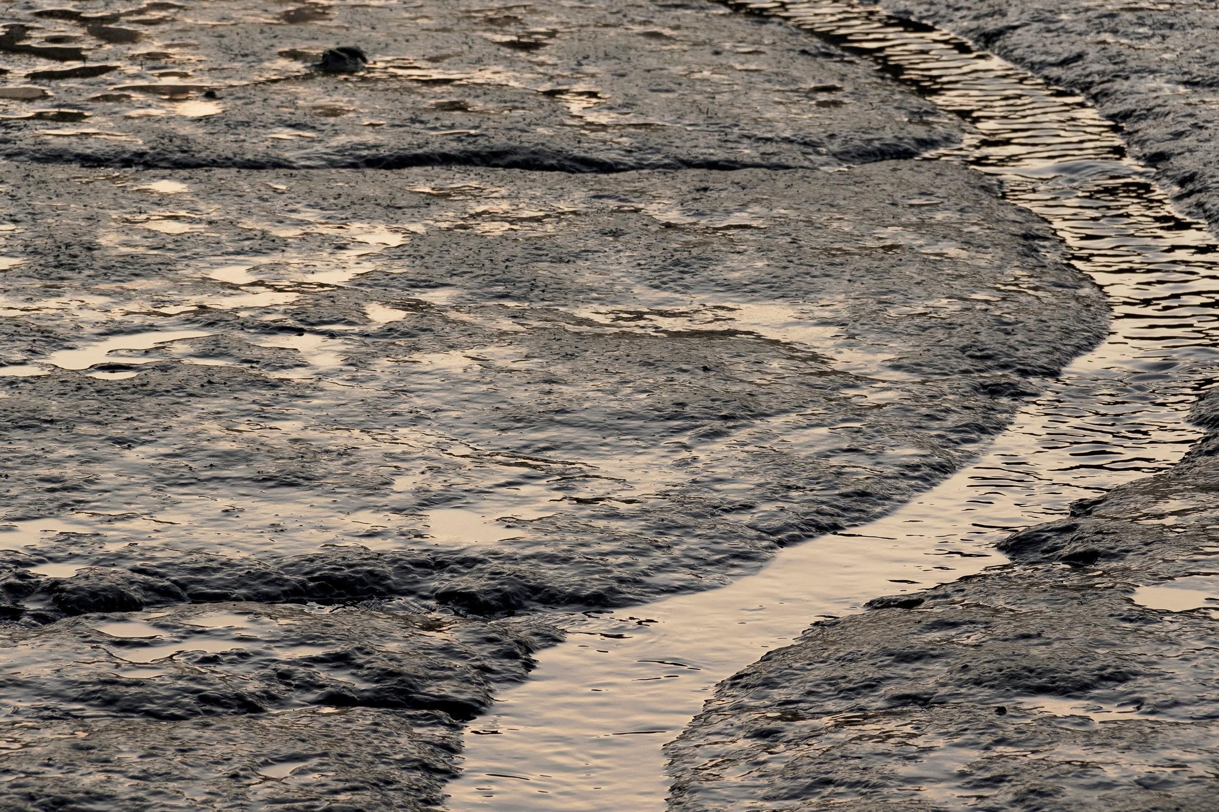 Landscape painting and photography historically has focused on presenting beautiful images. The content of this photographic series lies on the edge between what is beautiful and what is a mysterious or unappreciated beauty. The palette of silvers and grays is muted with small sections of color. Low Tide shows the mud flats of the Spuyten Duyvil creek viewed from Inwood in Upper Manhattan. Romancing the Stone captures a scene that could be set in a man made or vernal pool. Both works play with perception of depth and flattening space.