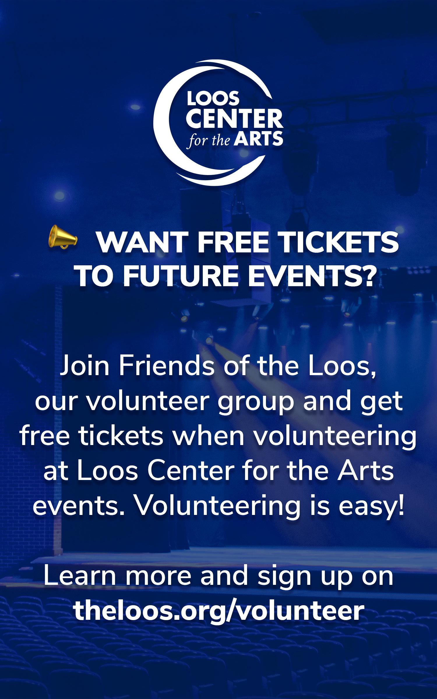 INDIVIDUAL TICKETS are available on our website, by phone, or at the venue box office, open two hours before each event’s start time (while tickets last). Loos Center for the Arts accepts all major credit cards, cash, and Loos Center for the Arts gift certificates.