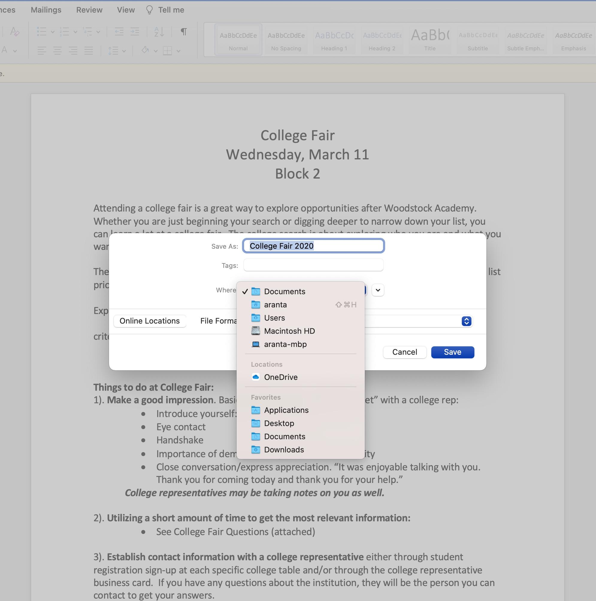 When saving your work, choose OneDrive from the dropdown menu under ”where”. Saving documents to OneDrive saves room on your iPad and allows you to access your work from any computer.