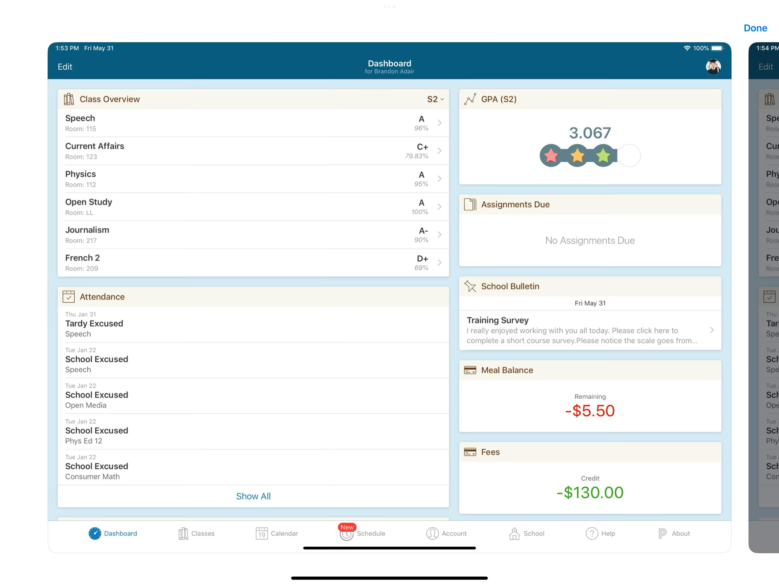 You will also be able to see your attendance record and your school meal and fees balances. You may incur fees from event participation or AP tests.