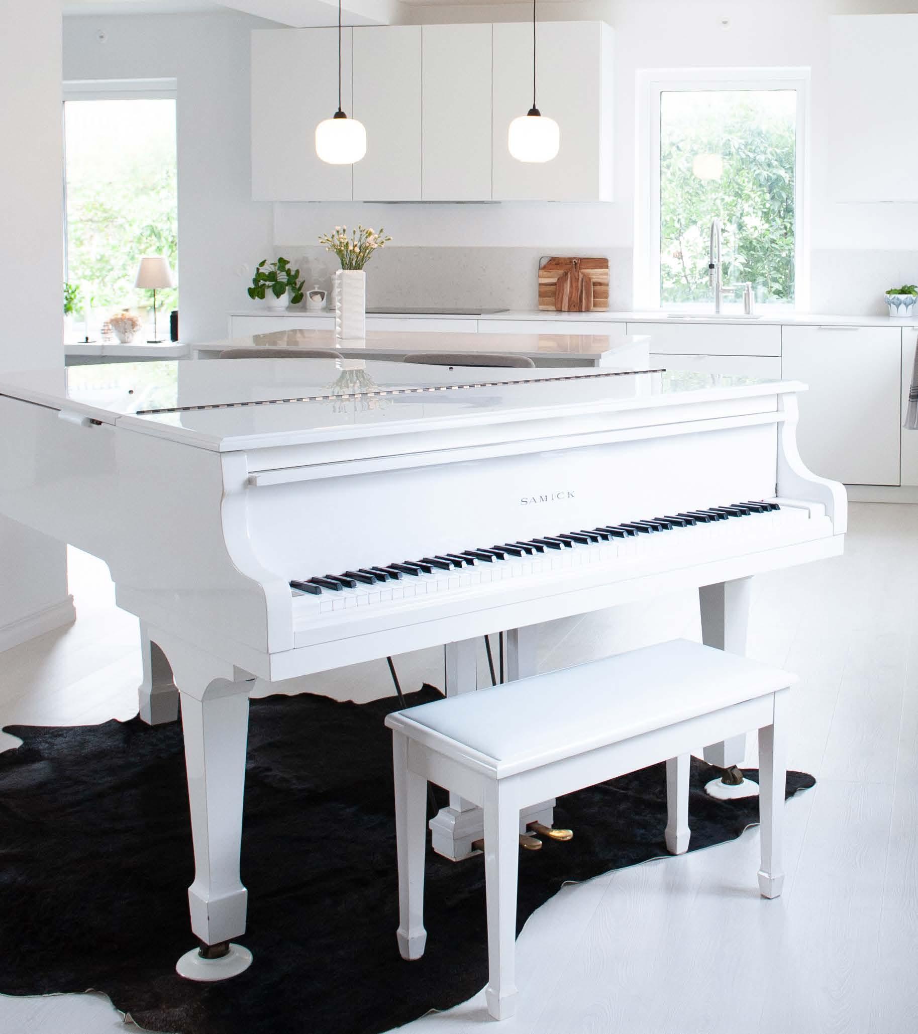 Det första vi möter när vi kliver in i det gula tegelhuset på Husensjö i Helsingborg är en magnifik vit flygel. Både Joakim och Kristina som bor här är musikintresserade och köpte flygeln när de bodde i USA. Efter många år utomlands beslöt de sig 2018 för att flytta hem till Sverige. Men resan till det underbara hus som vi befinner oss i idag har knappast varit spikrak.