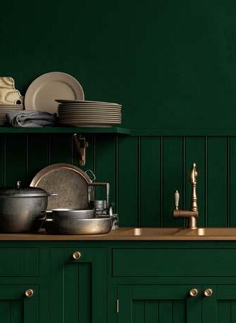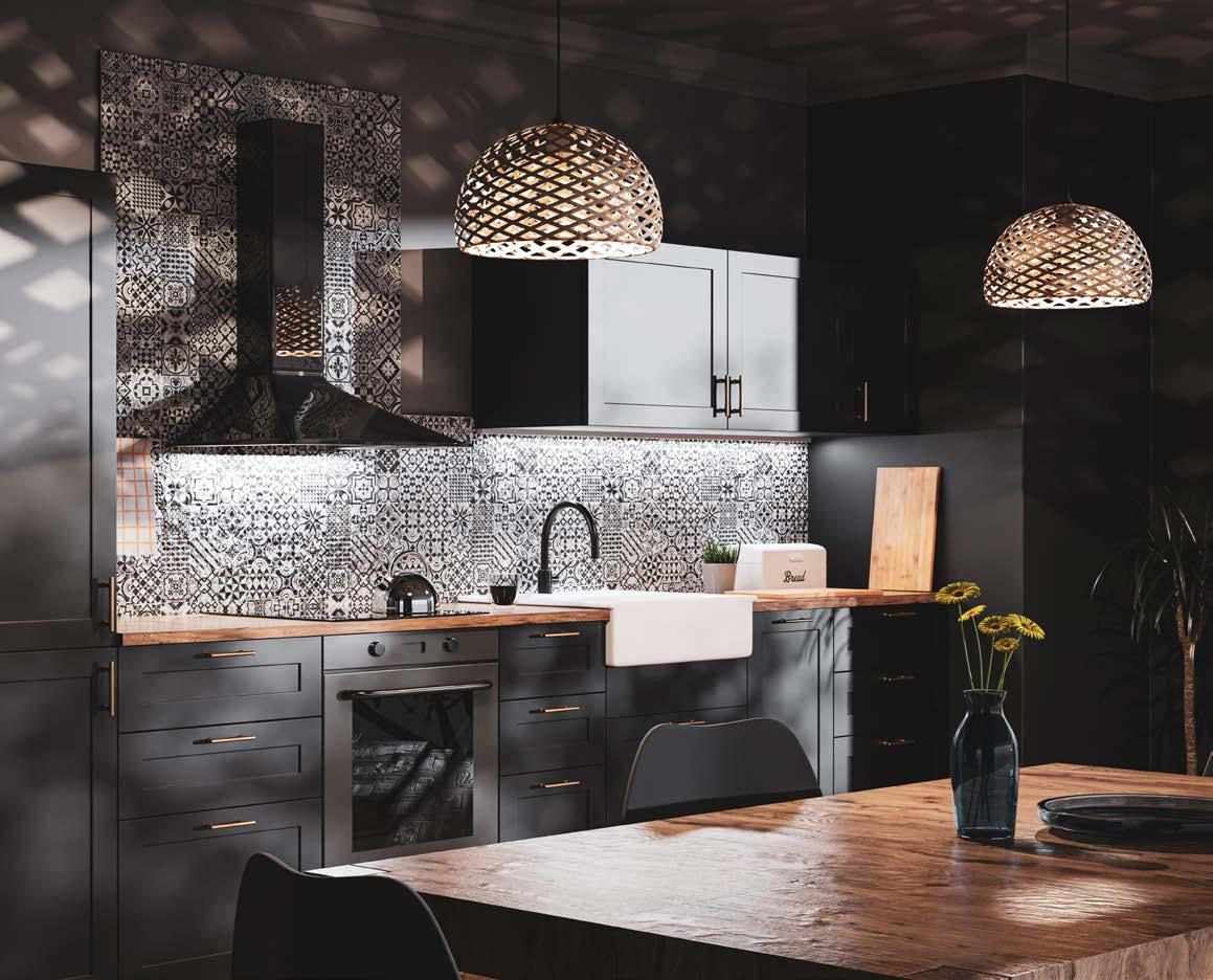Den svarta färgen grundar rummet och behövs för att övriga nyanser ska komma till sin rätt. Ett helsvart kök med luckor, bänkskivor, blandare och vask samma ton skapar en lyxig stämning. Den som inte vill gå hela vägen kan tillföra svärta genom att matcha detaljer, exempelvis genom att välja mattsvarta handtag och kran.