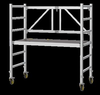Aluminiumställning för arbete på lite lägre höjd. Kan användas inomhus och på fast, slät mark utomhus. A-paketet består av en vikbar ram, hjul (125 mm) och plattform.