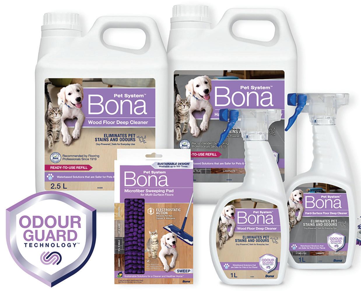 Maintain your UltraPet flooring by regularly sweeping or vacuuming to remove dirt and debris. Clean spills promptly with a mild, non-abrasive cleaner. Avoid harsh chemicals or scrubbers to preserve the flooring’s finish. We recommend the use of Bona Floor Care products to keep your floors looking brand new – refer to the next page for more information.