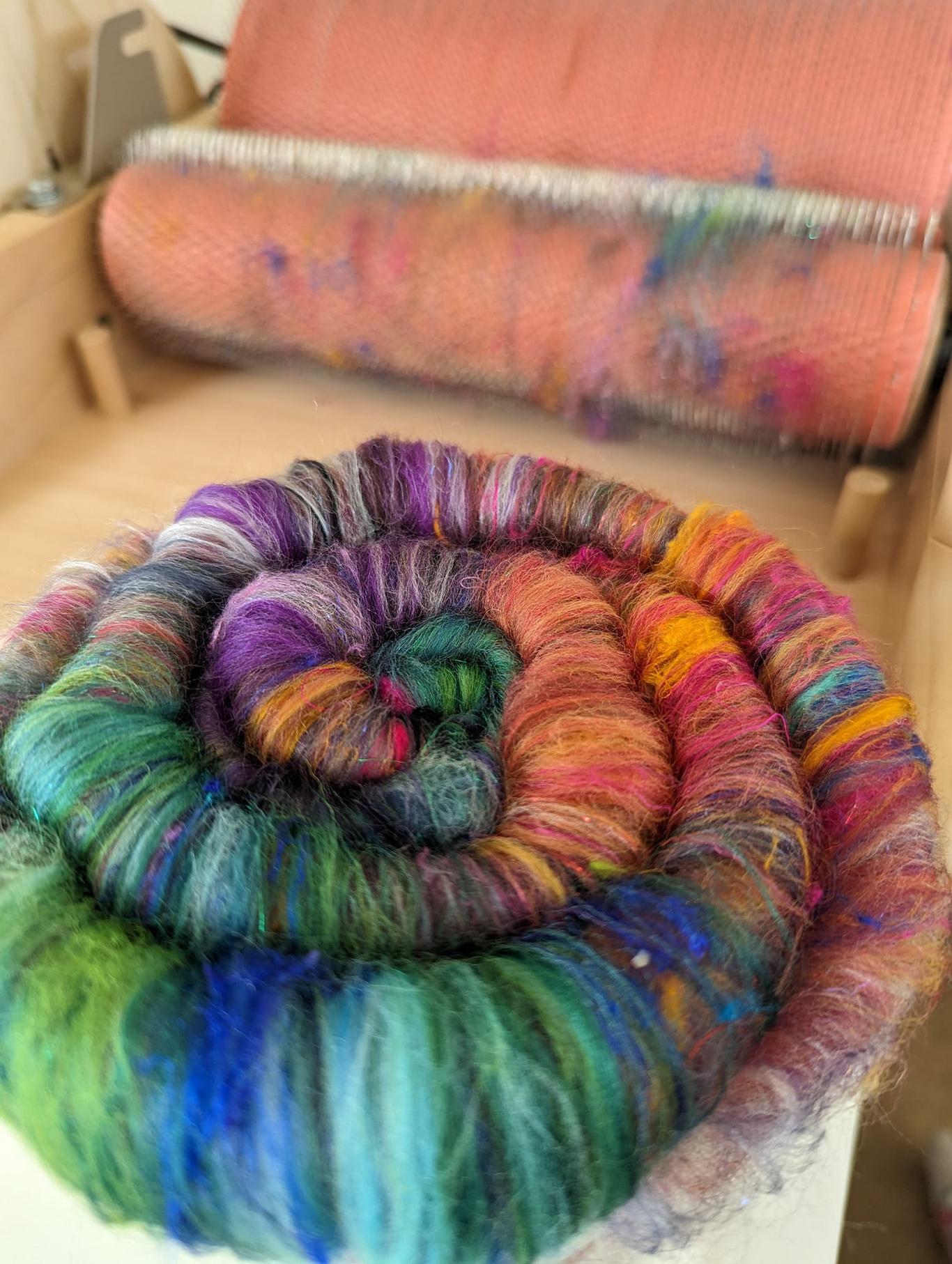 A new drum carder means we can now offer angora blend batts. Our fiber is always gently harvested by hand. We dye in small batched in my kitchen. We are now able to complete the blending process here at the farm to provide you with the finest spinning experience. Treat yourself! You earned it!
