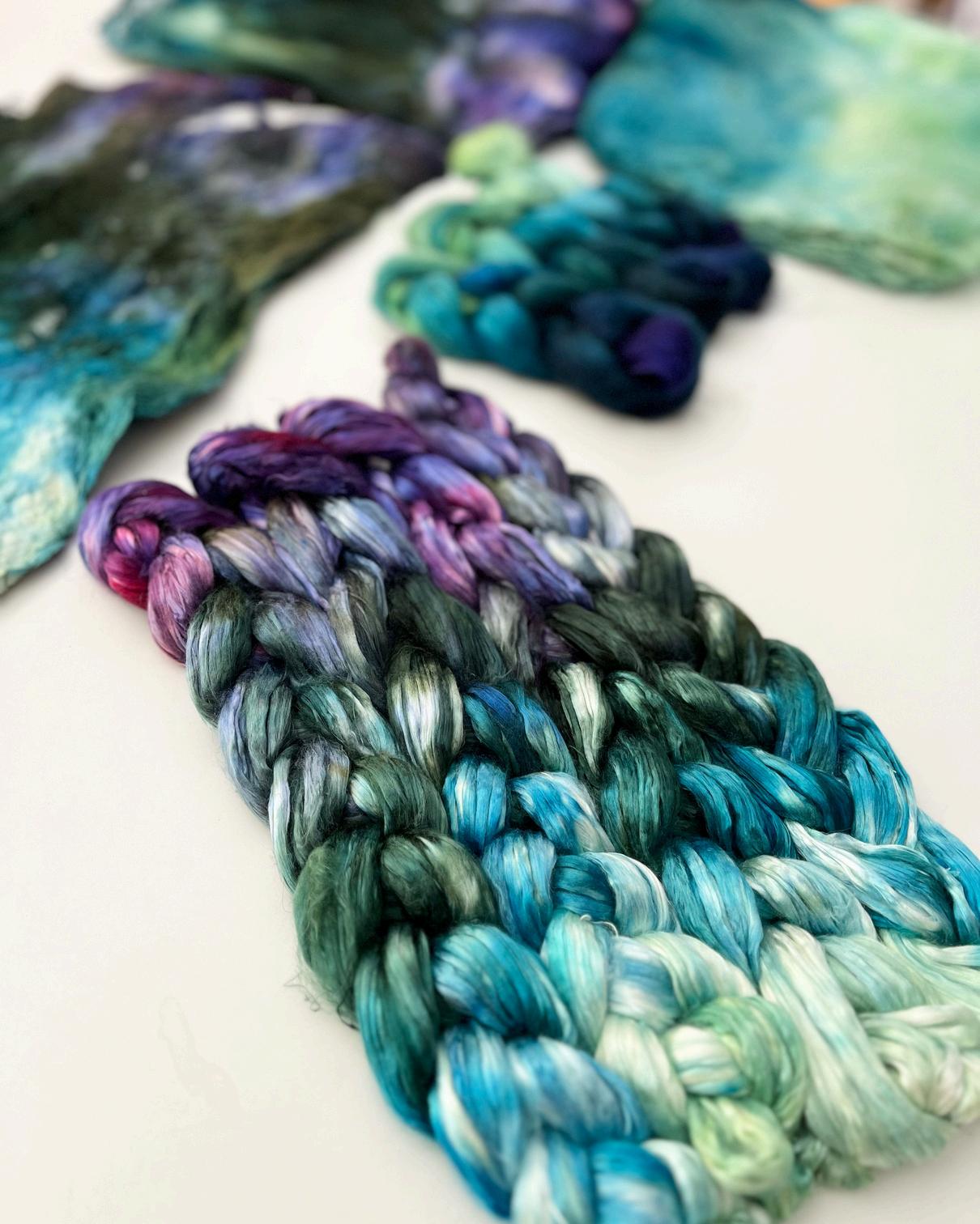 I like a variety of fibers and blends and enjoy knitting and occasionally weaving with new ones to see how they work up. I often dye different blends in the same pot to see the different ways they take the dyes.