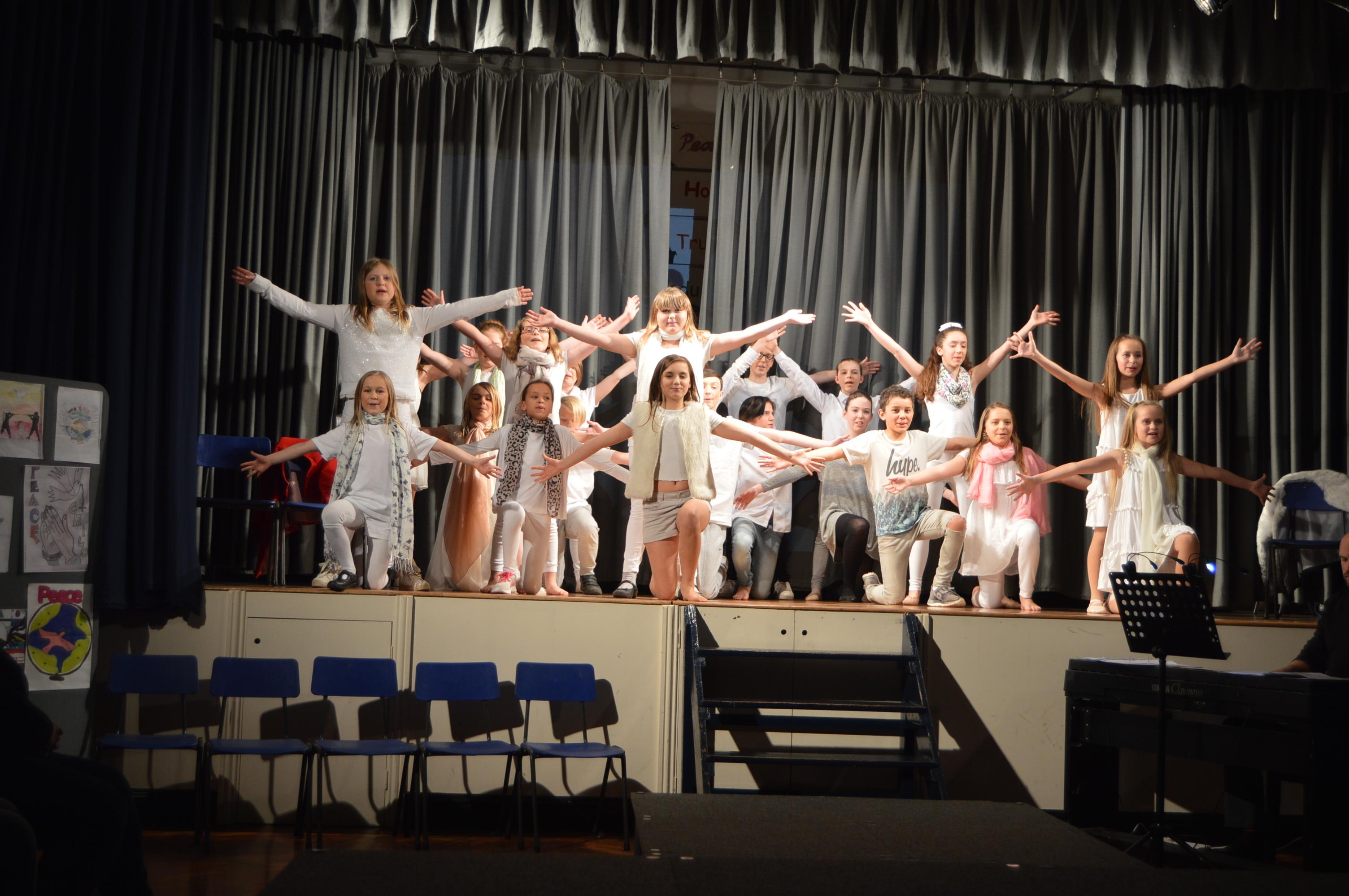They all reach the stage, and move to their places on the risers as the dancers perform centre stage, and all sing: