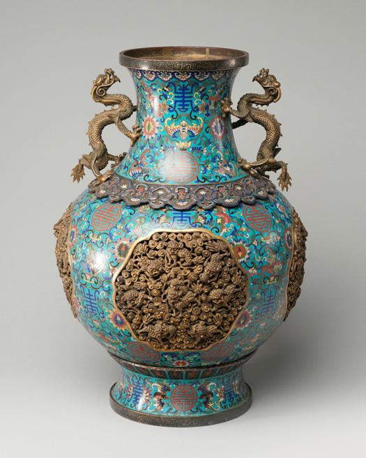 The large lower bulb of globular form rising to a curved waist, the upper bulb of slightly compressed globular form rising to a circular mouth, finely painted with nine five-clawed dragons chasing a flaming pearl amongst flames and swirling clouds and above turbulent rolling waves around the foot, all below a ruyi-head border to the neck, 27cm.