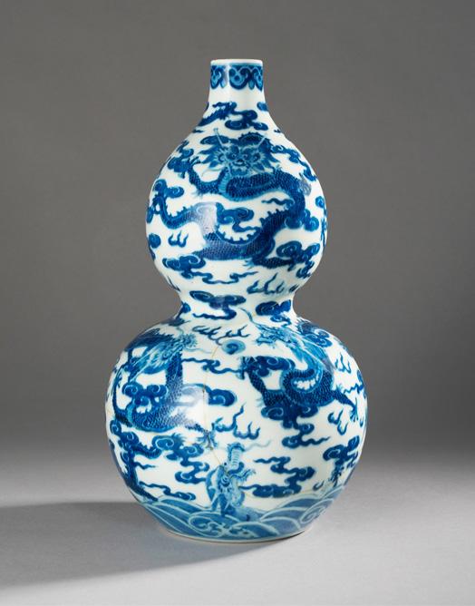 清嘉慶 青花九龍紋葫蘆瓶 《大清嘉慶年製》青花篆書款 來源:理查 亨利 切內維克斯 特倫奇爵士(1876-1954)收藏,之後由 家族傳承。葫蘆瓶本為一對,分別位爵士的後兩位後人繼承,另一尊 於本公司2025季春拍售出,編號127。