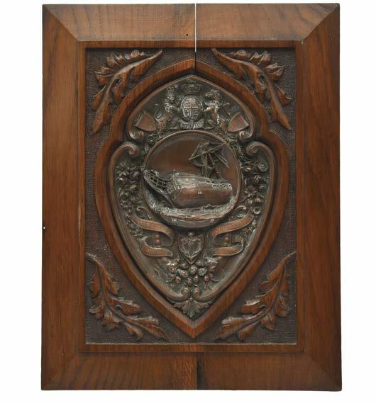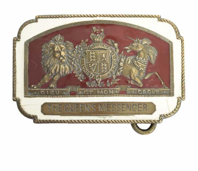 A rare and possibly unique Queen’s Messenger’s belt buckle made in the American manner, Victoria or Elizabeth II, brass and enamel, a slightly convex rectangular plate with stepped and radiused corners, the Royal Arms in fine relief to a red enamel ground within an arched panel, ‘THE QUEEN’S MESSENGER’ to a brass plate below, all against a general ground of cream enamel and within a roped border, impressed mark of the Bay State Jewelry and Silversmiths Co to the reverse incorporating ‘Patent no 104,012’, and ‘Serial No 82010’, brass loop fitting with embossed eagle and ‘WARRANTED FINEST MINTED BRASS’ to one end of the reverse and a small hook to the other, width 95 mm, minor blemishes to the enamel, good very fine.