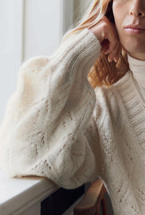LOCKERE PASSFORM, SOFTE GARNE. Ecopuno und Setasuri zaubern leichte, flauschige Styles. Netzgarn Ecopuno unterstreicht plastische Muster. Setasuri wirkt wie Mohair, ist aber ganz sanft zur Haut.