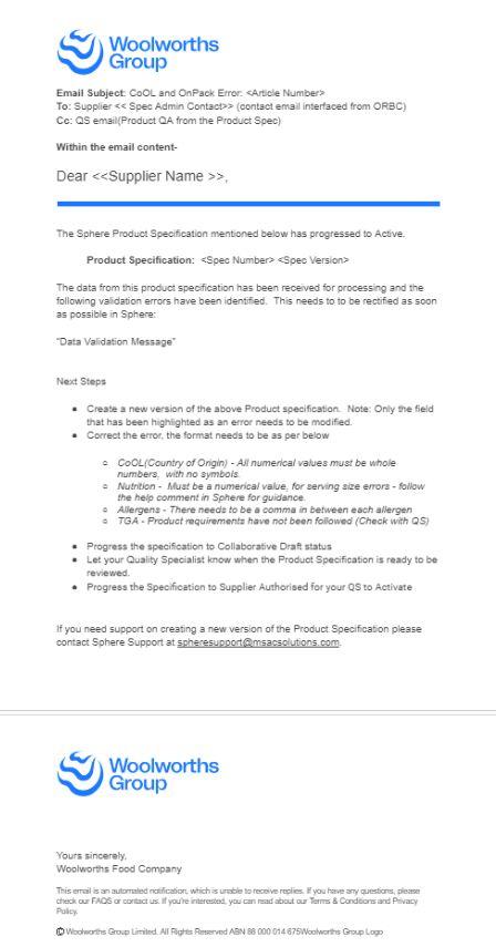 Getting our data right the first time will prevent the need to create another version of the Product Specification. Where errors occur, expect error message emails, which will delay Specification processes.