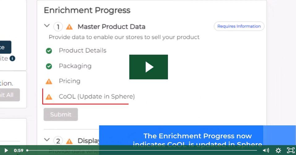 Enrichment includes the completion of Master Product Data. Sphere is the source of truth and will send the data to Partner Hub for Country of Origin Labeling (CoOL) & Displayed On Pack information.