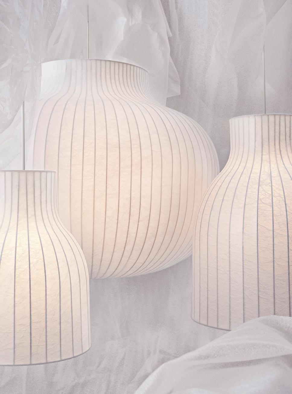 “With its cloud-like appearance, the Strand Pendant Lamp is designed in a unique cocoon material that filters light through for a comfortable glow.”