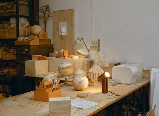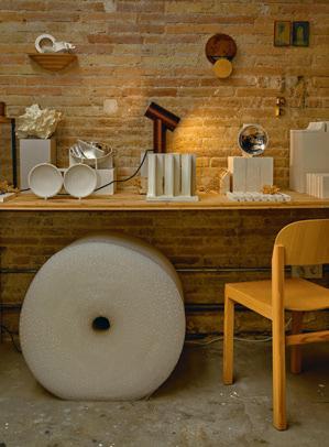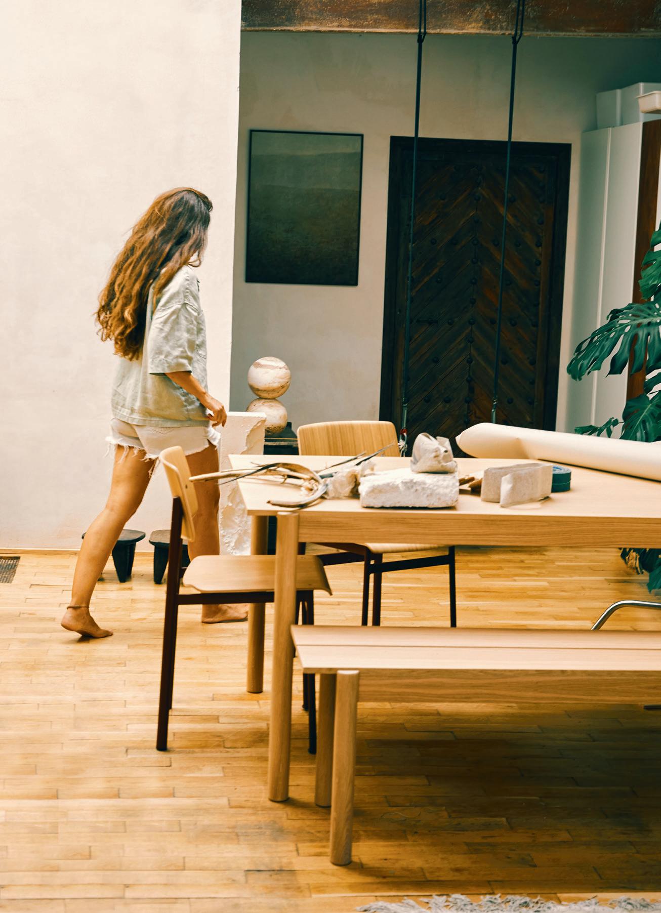 The home of artists Mateo Fumero and Minerva Capdevila, co-founders of Turbina Studio, is defined by its fluidity. The pair, partners in life and work, are based in a former dry cleaner in Sants, Barcelona. There, they live in a warm, raw, textural space with a neutral palette, lots of lush green plants, and an ever-evolving collection of objects. The open-plan living area they share with their three-year-old daughter, Rita, is connected to their workspace—a large, open room full of machinery, objects and material archives—allowing the artists to step seamlessly between home and work, life and art. From hour to hour, day to day, their young family eludes regularity and routine. Instead, their time is ruled by how they feel, what they need in the moment, and how much longer one of their newly created sculptures might need to dry in the studio, before they can resume work on it. It’s an unconventional way of life, and their space has evolved to accommodate it. Except, that is, in the kitchen-cum-dining area, which is configured around a simple, elegant table and accompanying bench. Overhead, the skylight provides a direct connection to the sun, the moon and the cosmos, which play such an elemental role in the studio’s practice. (Turbina, whose name refers to the idea “of generating things, of transforming energy, or being in continuous motion”, is driven by the duo’s interest in the universe, the planets and their orbits, space and time.) But Mateo, Minerva and Rita spend much of their time in this family space, cooking nourishing meals for lunch and dinner. The living space is, if you like, the axis on which the whole home turns.