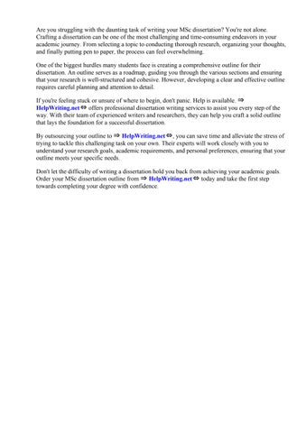 Don't let the difficulty of writing a dissertation hold you back from achieving your academic goals. Order your MSc dissertation outline from ⇒ HelpWriting.net⇔ today and take the first step towards completing your degree with confidence.