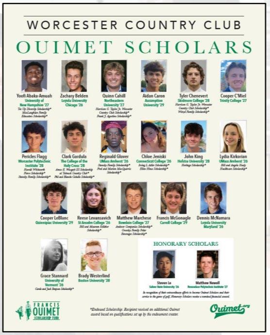 As a club, we are proud to continue to support the Francis Ouimet Scholarship Fund Bag Tag Program. This annual program not only helps the young men and women working here at the club, but young people all over the state to pursue their goals of higher education. These scholarships, given to 535 students for 2025 (New record), help make their college and professional dreams a reality. Worcester can proudly say that we are part of the success of more than 6,500 Alumni from across the state.